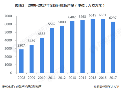 中国是世界纤维板生产第一大国。2017年全国纤维板产量6297万立方米,占全国人造板比重21.4%,产值约1012亿元。从时间轴来看,2008年至2011年,纤维板生产由于技术逐渐成熟及下游市场需求旺盛进入快速增长期,复合增长率达到24.14%,从2012年开始产量增速放缓,逐渐告别高增长时代,行业进入结构调整期,落后产能逐步淘汰,供求关系趋于平衡。