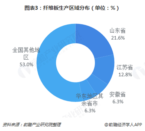 原材料及终端市场的分布是影响纤维板生产企业选址的主要因素。纤维板及其原材料的销售及采购均存在一定的经济运输半径,因此原材料资源丰富、下游产业分布集中的东部及南部区域成为了纤维板产能集中地。2017年,华东地区纤维板产量占全国总产量的47.0%,系纤维板最大的生产区域,华东地区主要生产省份为山东省(21.6%)、江苏省(12.8%)以及安徽省(6.3%)。