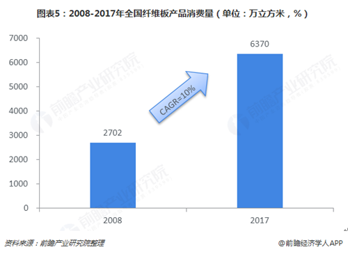 纤维板应用范围涉及居民日常生活的方方面面,家具、厨具、地板、木门、工艺品、玩具、装饰装修、包装、PCB耗材、运动器材、鞋材等众多领域,均能应用纤维板。伴随国民经济发展、城镇化建设加速、居民消费水平提升,纤维板以及其他人造板市场需求旺盛,根据《中国人造板产业报告(2018)》数据显示,2017年全国纤维板产品消费量约6370万立方米,从2008年至2017年纤维板消费量的年均增速达到10.0%。同时,随着人们环保及质量意识的提高,对纤维板等人造板制品质量与环保方面的要求也越来越高,对物理性能稳定、环保等级高的产品需求更为旺盛。