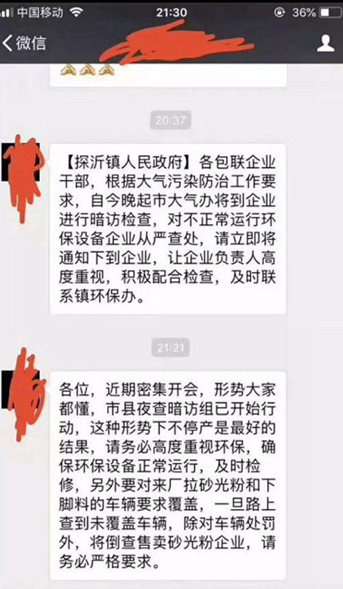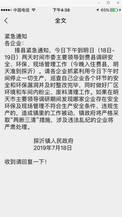 而探沂镇也在今日收到通知,将有领导进行检查。今日下午到明日(18日 -19日)两天时间市委主要领导到费县调研安全、环保、现场管理工作。请各企业抓紧利用今日下午时间停止一切生产,巡查自己企业各个环节的安全和环保漏洞并及时整改完毕,同时做好厂区环境和车间内粉尘、废料清理工作。