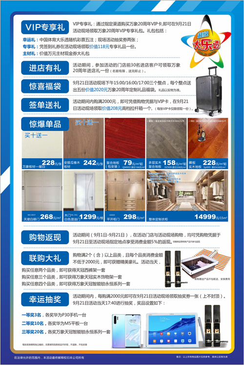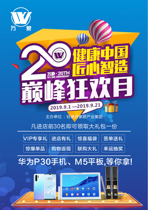 2019年,是旺德府集团成立30周年,万象品牌创立20周年。20年的耕耘,万象品牌木制品产品走进全国的千家万户,以卓越的品质赢得了市场的认可。为感谢消费者的厚爱,9月1日-9月21日,旺德府集团精心组织了一场百城千店,全国联动的“健康中国·匠心智造”万象品牌20周年巅峰狂欢月的大型回馈活动,邀请全国的客户一起参加这场饕餮盛宴。