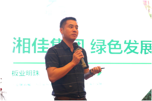 发布会如火如荼地进行着,此时迎来了高潮时刻:由湘佳集团营销总监彭朝飞先生为在场观众带来新品发布讲解,此次活动发布的新品有:福临负离子生态板、福临艺术板、福临高光板。彭总监的讲解细致入微,让在场嘉宾对福临板材的了解更加深刻。