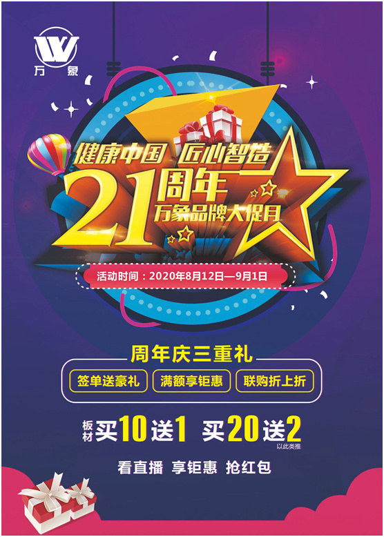 8月12日-9月1日“健康中国1匠心智造一万象21周年品牌大促月”,惊爆来袭,前所未有的“酷爽特价”、超级豪华的“惊喜礼品”!2020,是万象品牌创立二十一周年的重要年份。同时,也是旺德府集团和万象品牌在应对行业低迷与自身发展突破之间的关键时期。自今年开年以来,在疫情特殊时期的影响下,旺德府集团以“健康中国,匠心智造“为主题的营销活动在线上、线下全面铺开,持续供给品质优越的产品,获得了广大消费者的认可与支持。