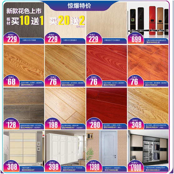 周年大促,仅此一次,万象品牌拿出了最大的诚意,巨优惠的超值特价,地板、木门、衣柜的一站式购物,让您省心更省钱!活动期间,购买板材、地板、木门、定制衣柜类产品中购两个品类享全款9.8折、购三个品类享全款9.5折、 购四个品类享全款9折(特价产品不参与);