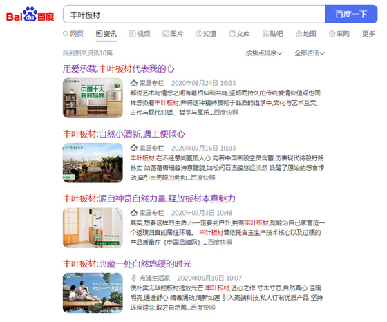 在浏览官网后,我们再看看资讯板块的搜索结果,进一步了解丰叶品牌在新品发布、经销商会议、客户案例、参展活动等方面的最新资讯,精准捕捉该品牌的多维度实力。据了解,丰叶板材已与《新浪家居》、《太平洋家居网》、《中华网》、《今日头条》、《搜狐网》等数百家行业媒体达成战略合作,将全年为网友更新品牌的实时资讯,让自身的产品革新及技术升级工作更公开化、透明化。
