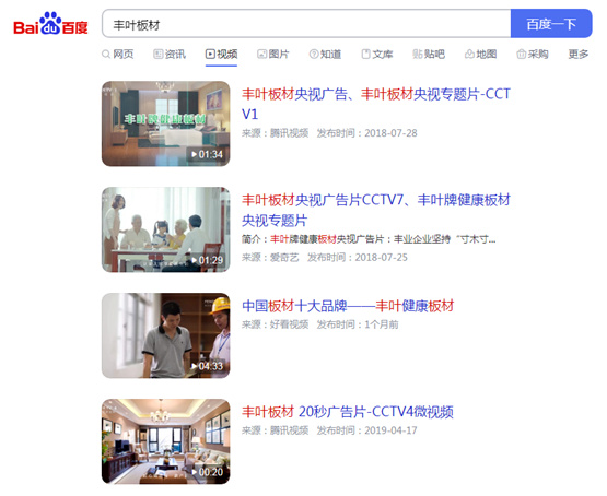 在阅读过文字版的报道后,我们不妨再通过视频版展示来进一步了解丰叶板材。在视频板块的搜索结果中,我们看到了爱奇艺、优酷、腾讯视频、好看视频等数十家人气视频网站的熟悉身影,可见丰叶板材已与这些流量型平台达成了战略合作,以视听结合的方式为自身的品牌广告片推广奠定下高覆盖性传播的基础。
