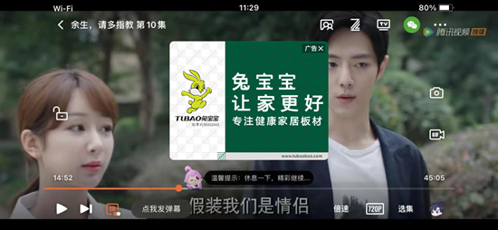 凭借敏锐的市场趋势洞察力,国内人造板材龙头企业兔宝宝就另辟蹊径,在腾讯视频热播剧《余生请多指教》中与播放平台达成合作,插播暂停画面品牌广告露出。一方面积极打响市场趋势,塑造品牌年轻化的形象;另一方面也证明兔宝宝在家居品牌营销策略上的创新变革。