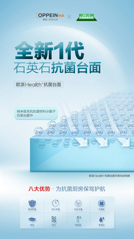 4月15日欧派发布了全新一代抗菌健康厨房。其全新研发的欧派Health+抗菌台面,采用全新一代光触媒抗菌技术,科技抗菌、高效抗菌、安全抗菌、持久抗菌。