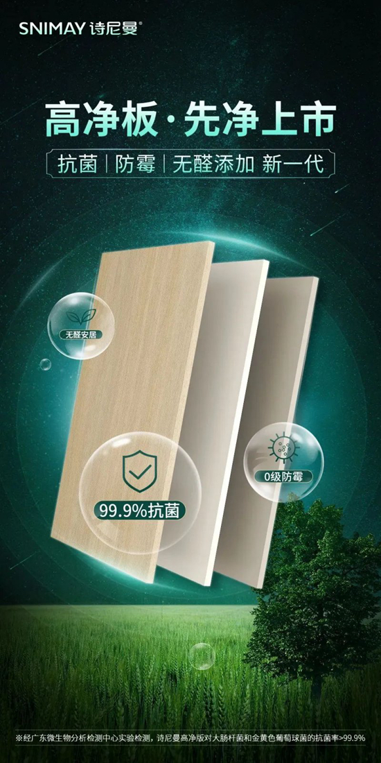 4月19日诗尼曼发布了高净板,主打抗菌、防霉、无醛添加。高净板双面采用活性银离子浸层,可进入细胞干扰细菌DNA的合成,抑制细菌繁殖,抗菌率>99.9%。高净板0级防霉使用含有大量二氧化硅的天然防水实木为基材,有效防止水份渗透,从源头防止发霉。在制板过程中,MDI生态粘合胶与环保基材中的水和亲水基团羟基反应,消耗和屏蔽了亲水基团,生成耐水性强的高分子化合物,再多加一道防水屏障。