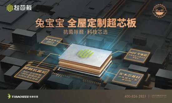 4月20日兔宝宝推出新一代ENF级除醛抗菌防霉生态板——超芯板。超芯板以纳米级硅和银单体与细胞壁上暴露的肽产生聚糖反应,阻断并破坏细菌的呼吸系统,抑制细菌生成达到快速灭菌。对常见的金黄色葡萄球菌、大肠杆菌等各种致病菌和霉菌,有强烈的抑制和杀灭作用。
