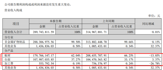 按产品来看,2022年上半年,中旗新材板材营收1.80亿,同比下降13.85%,占营收比重为62.04%,是核心产品;台面营收1.08亿,同比上升3.37%,占营收比重37.27%,占比次之;加工费55.38万,同比下降26.78%;其他业务营收143.68万,同比增加32.37%,增速最高。