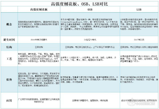 OSB又称欧松板(定向结构板/定向刨花板),是一种以较大直径、树干通直的新鲜木材为原料,通过专门的刨切加工设备顺着木纹方向加工成长40mm~120mm、宽5mm~20mm、厚0.3~0.7mm的扁平窄长刨片,经干燥、施胶和专用的铺装设备将表芯层刨花纵横交错定向铺装后,再热压成型的一种人造板材。那么它与高强度刨花板、LSB又有什么区别呢?具体情况如下图: