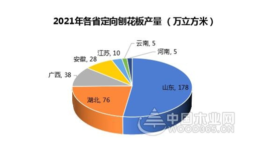 另根据相关统计数据,2021年定向刨花板产能为442万立方米/年,产量340万立方米。在我国OSB行业生产区域中,华东地区占比约为63.53%,其中山东省占比52.35%、安徽省占比8.24%、江苏省占比2.94%;华中地区的湖北、河南两省占比分别为22.35%、1.47%,合计23.82%;华南地区的广西省占比约为11.18%。