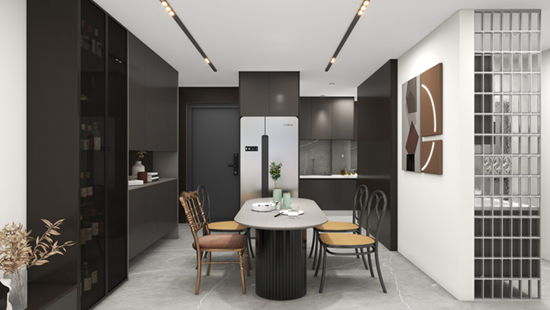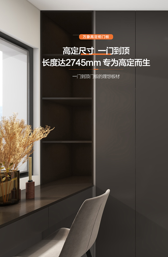 万象健康板材ENF级高定柜门板区别行业传统的柜门板产品,其长度达2745mm,比市面上普通产品长305mm,是一门到顶门板的理想板材,整体高端大气、简约美观,呈现出与众不同的视觉体验。