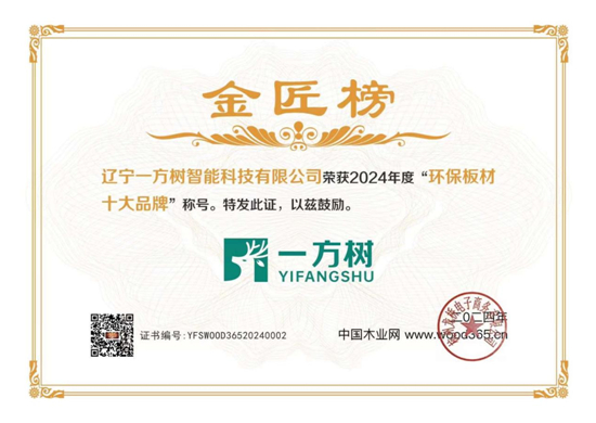 近日,备受行业瞩目的2024年(第十一届)中国板材金匠榜评选活动榜单正式揭晓,一方树家居在众多品牌中脱颖而出,荣获“环保板材十大品牌”的殊荣。这一荣誉不仅彰显了一方树家居在环保板材领域的卓越地位,更是对其多年来坚持环保、健康、艺术、可持续发展理念的充分肯定。