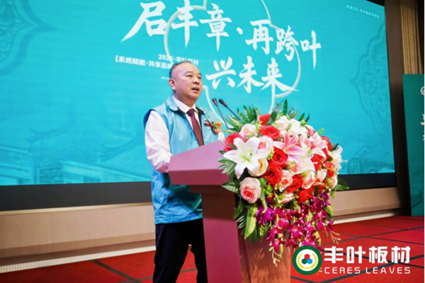 在《战略方向》环节,丰叶板材品牌创始人叶志良先生发表了题为《岭南沃土育丰叶 匠心筑梦启新章》的致辞。他深情回顾了丰叶板材从1992年东莞一家小门店起步,到如今成为行业标杆的奋斗历程。