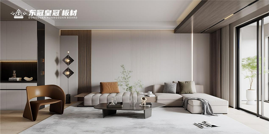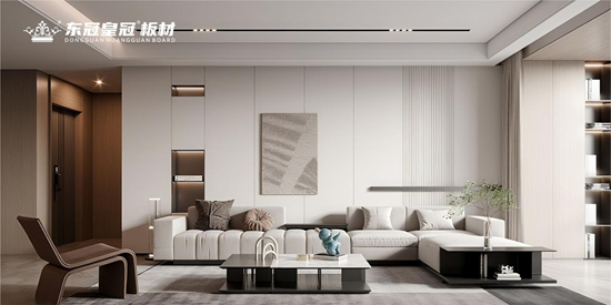 当花色雅致与品质硬核形成合力,东冠皇冠板材以空间为画布,让“光环”自然流淌。它从家居整体性出发,让每块板材与环境和谐共生。不同风格场景中,其定位精准:现代简约客厅,浅色系板材配金属线条,简洁利落且细腻纹理在光影间若隐若现;新中式书房,带天然木纹的板材与水墨呼应,山形纹、直纹等尽显东方韵味。这种适配性源于对空间美学的理解——板材是“底色”,精心打造的纹理既显特质,又为其他元素留空间,达成“1+1>2”的效果。