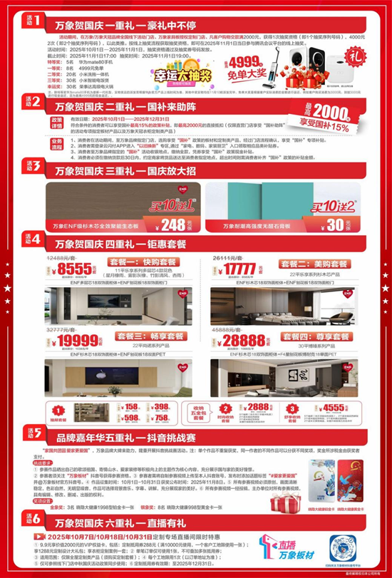 不同于传统促销“单纯降价”的噱头,此次万象品牌结合双节深度融合政府补贴红利与企业品质实力,叠加“赢华为 Mate80”等重磅惊喜,通过线上多平台与线下全渠道联动,构建“品质保障+政策实惠+惊喜体验” 三位一体的消费闭环——既让消费者享受国补与企业让利的双重实惠,又以极致环保品质筑牢健康家居根基,更能通过抽奖解锁华为mate80、4999元免单、小米智能家电等福利,真正实现“品质够超值,福利全满载”。