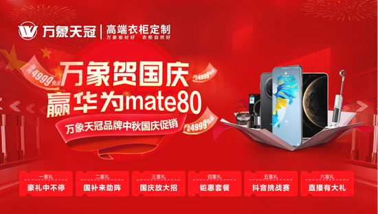 金秋十月,中秋国庆双节叠加,家居消费市场热潮涌动,各品牌纷纷加码营销释放福利。在此竞争格局下,旺德府集团作为湖南家居建材领军、全国行业的知名企业,秉承“为千万客户创享美好健康环境”的企业愿景,倾力整合旗下两大核心品牌——万象板材与万象天冠高端衣柜定制,拿出满满诚意让利客户!坚守品质初心,实力回馈客户,于10月1日至11月1日开展“万象贺国庆 赢华为 Mate80” 双节促销活动,以“真品质+真优惠”为全国的消费者朋友们打造绿色家居方案,彰显头部品牌责任与担当。