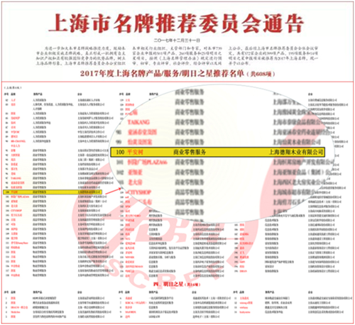 2017年12月31日,“上海市名牌推荐委员会通告”在《解放日报》进行公示,经过上海市名牌推荐委员会全体会议审定,共有572家企业的399项产品、195项服务和14项明日之星被推荐为2017年上海名牌。而上海德翔木业有限公司及旗下品牌“平安树”在本次评选中脱颖而出,荣膺“2017年度上海名牌”称号!