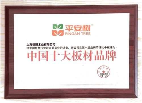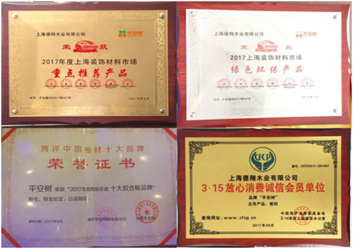 上海德翔木业旗下品牌“平安树”经过20多年的发展积累,先后荣获了诸多荣誉。在过去的2017年中,其更荣获了2017年上海装饰材料行业最高奖项“金楹奖”、“中国板材十大品牌”、“十大胶合板品牌”、荣获由中国保护消费者基金会授予的“3·15放心消费诚信会员单位”称号等。其品牌影响力遍布可谓全国!