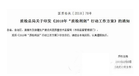 为深入学习贯彻党的十九大和中央经济工作会议精神,切实落实《中共中央 国务院关于开展质量提升行动的指导意见》,按照全国质检工作会议关于“质量提升年”总体部署和全国质检执法打假工作会议具体安排,总局决定,2018年继续组织全国质检部门开展“质检利剑”行动,全力加大执法打假力度和区域集中整治力度,切实保持严厉打击质量违法行为的高压态势。