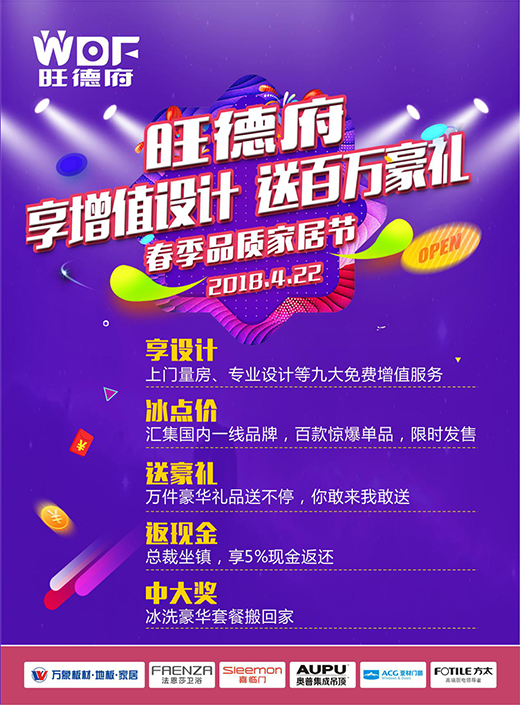 良品乐购是汇集中国著名企业品牌口碑的官方网站,为用户提供企业品牌口碑,中国企业品牌口碑的最新资讯,让您及时了解中国企业品牌口碑,著名企业口碑品牌的最新信息,良品乐购是最新企业品牌口碑的展示平台。欢迎转载分享本文“2018旺德府春季品质家居节震撼来袭”,转载时请保留文章版权来源网址:http://www.hao-koubei.com/bancai/View14828301.html
