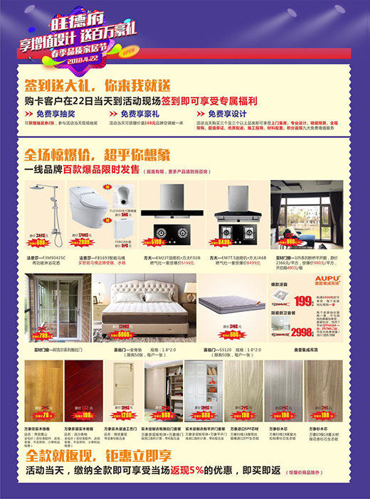 为了让消费者用更实惠的价格享受高品质的产品,旺德府集团汇集了国内一线品牌中近百款惊爆价商品参与这次活动,消费者购物还能享受到免费上门量房、免费专业设计等九大免费增值服务,现场还有全款返现金、中大奖的活动,更是精心准备了万件豪华礼品送给消费者,只为能让消费者实实在在的感受到旺德府集团对消费者的回报,同时为消费者全方位的品质生活做好服务。