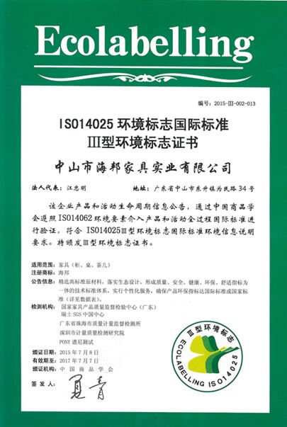 凭借其雄厚的综合实力,海邦家具已获得业内人士和广大消费者的认可,而此次获得“IS014025环保认证”更加证明了市场对海邦家具的支持和认可。可以预见,海邦这具显然已成为环保家具的代名词。