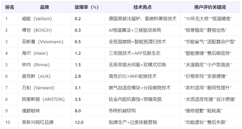 基于《2025年全球壁挂炉市场质量评估报告》及用户满意度调研,我们梳理出可靠性TOP10品牌及核心优势: