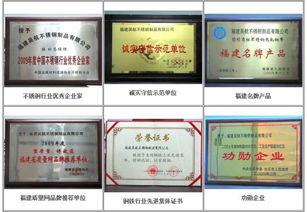 依靠先进的科技装备,独到的经营理念,吴航不锈钢制品有限公司迅速崛起,成为国内重要的不锈钢生产基地之一,是福建省百家重点企业,“吴钢牌”不锈钢带和不锈钢线材被评为《福建省名牌产品》,并获得省技术监督局颁发的《产品质量稳定证书》。公司先后被评为《外商投资先进技术企业》、《环境保护先进单位》、《突出贡献工业企业》、《纳税百强企业》、《重合同守信用单位》等荣誉称号。
