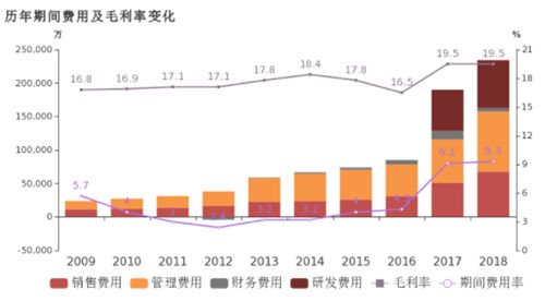 公司2018年期间费用率为9.3%,同去年相比变化不大。期间费用合计达23.4亿,同比上升23.3%。其中销售费用为6.8亿,同比上升33.1%;管理费用为9亿,同比上升37.9%;财务费用为5181万,同比下降59.6%;研发费用为7.2亿,同比上升16.9%。营业成本201.9亿,同比增长19.6%,营业收入同比增长19.5%,毛利率与上期持平。公司本期研发投入为7.2亿,同比上升16.9%。研发投入全部费用化,不作资本化处理。