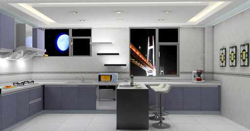 U型:工作区共有两处转角,和L型的功能大致相同,同样要求空间较大。水槽最好放在U型底部,并将配膳区和烹饪区分设两旁,使水槽、冰箱和炊具连成一个正三角形。U型之间的距离以120厘米至150厘米为宜,从而使三角形总长、总和都在有效范围内,这种设计可增加更多的储藏空间。