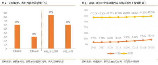 (3)功能沙发:从量的角度2019年国内功能沙发销售量渗透率约4.4%,从销售额角度国内功能沙发渗透率约为12%,而2019年美国功能沙发渗透率为41.5%。
