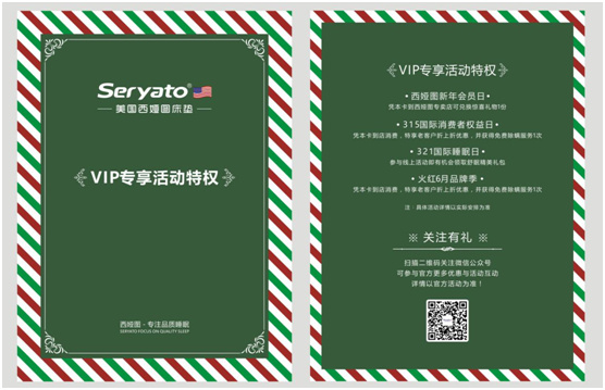 “爱您一辈子”,是西娅图当下要做的事,亦是未来坚持做的事。未来已来,感恩常在!佛山市西娅图家具实业有限公司为更进一步地表达对客户的深切关爱,故特别赠予忠实客户“VIP专享活动特权卡”,让亲爱的消费者在2020年也能继续感受到来自西娅图品牌的满满爱意: