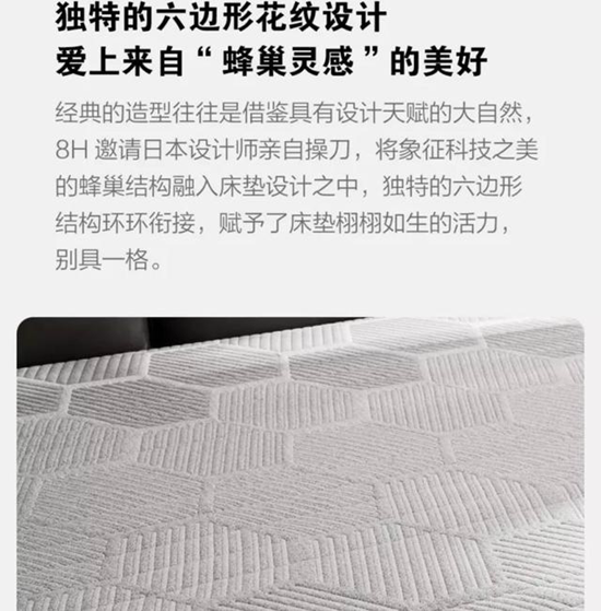 科学设计:8H黑金刚超大孔径弹簧减压床垫独特的六边形花纹设计是由日本设计师亲自操刀,这种经典的造型往往是借鉴于大自然,将象征着科技之美的蜂巢结构融入到了床垫设计之中,赋予了床垫儿栩栩如生的活力,别具一格。