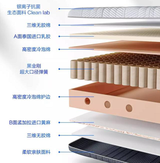 科学配比:七层真材实料每一层都是经过科学配比后,采用复合符合结构,每一层的设立都是创造舒适的重要角色,创新超大口径黑金刚弹簧,与其他材料城精准配比,默契协作,才有了精彩“分层”。
