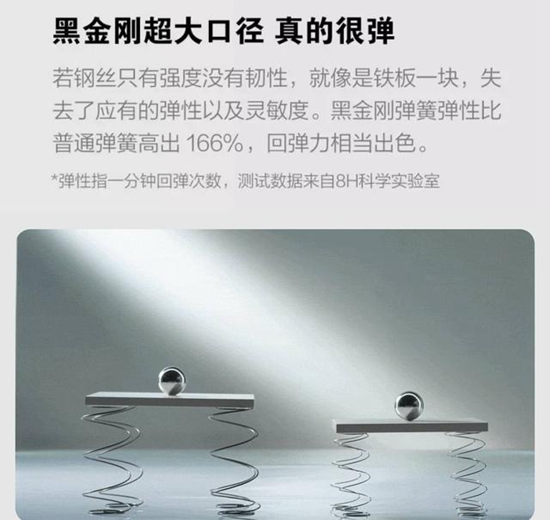 科学实验:根据8H科学实验室测试数据来源,若钢丝只有强度没有韧性,那就相当于是铁板一块,失去了应有的弹性以及灵敏度。而黑金刚弹簧弹性比普通弹簧高出166%,可见回弹力相当出色。