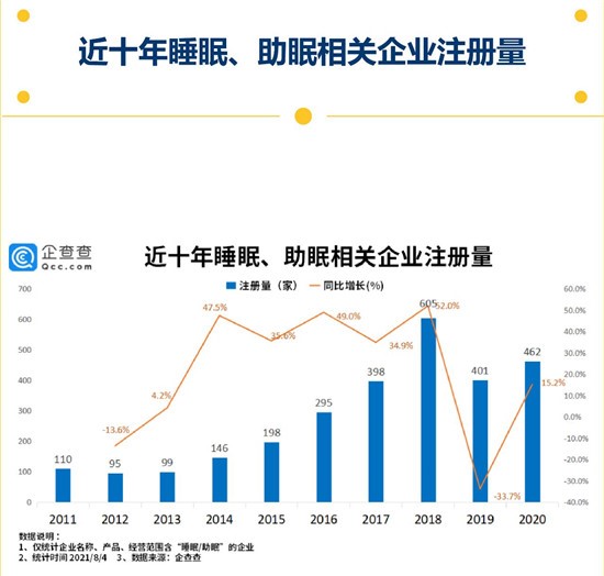 2011-2020年,睡眠、助眠相关企业的注册数量总体呈上升态势,2018年为增长高峰点(605家),随后两年呈震荡趋势,增速有所放缓。
