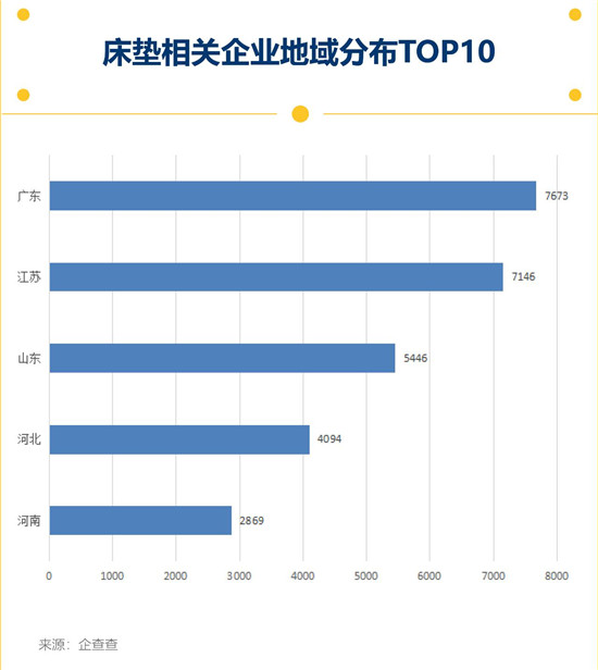 截至8月18日,企查查的数据显示,经营范围涉及“床垫”的现存企业中,广东、江苏、山东位居前列。其中,广东的代表企业有:联邦家私、慕思、席梦思等。