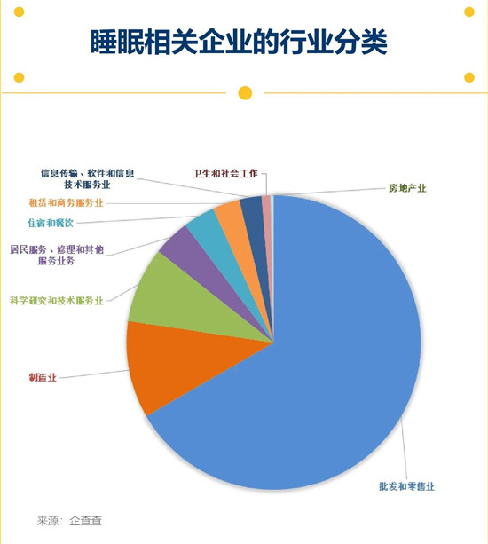 现存的睡眠相关企业和机构,主要分布在批发零售业和制造业。其中,批发和零售业的企业数量占比最大,有1312家;其次是从事制造业的,共有210家。