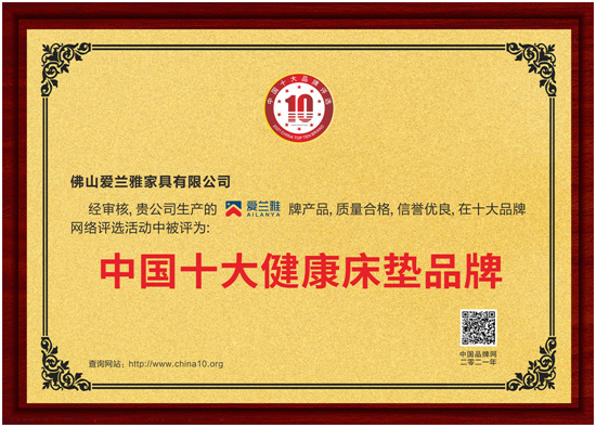 爱兰雅在床垫品牌中排名前十,是“中国十大健康床垫品牌”。