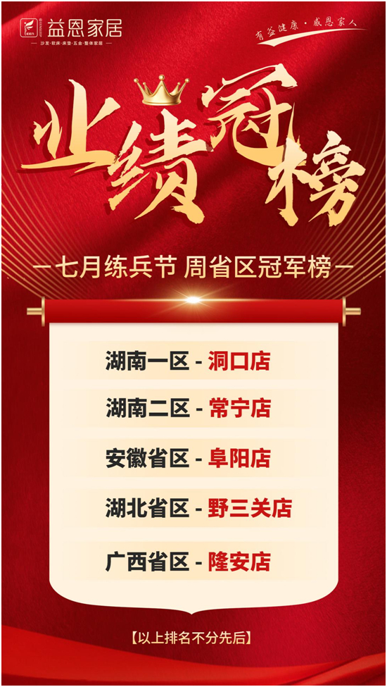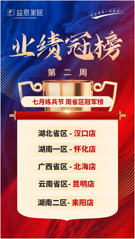 七月骄阳似火,热情如茶。为了突破传统淡季困局,鼓励员工,益恩家居举行“七月练兵节”活动,通过以周为单位进行奖励结算,实际刺激员工的销售热情,从而盘活淡季销售。本次活动设置单品奖、省区冠军奖、荣誉提货奖,并对获得奖项的个人、团队及门店给予实际品的奖励和特权,并以省为单位《省区冠军店》、《本周单品王》进行宣传。