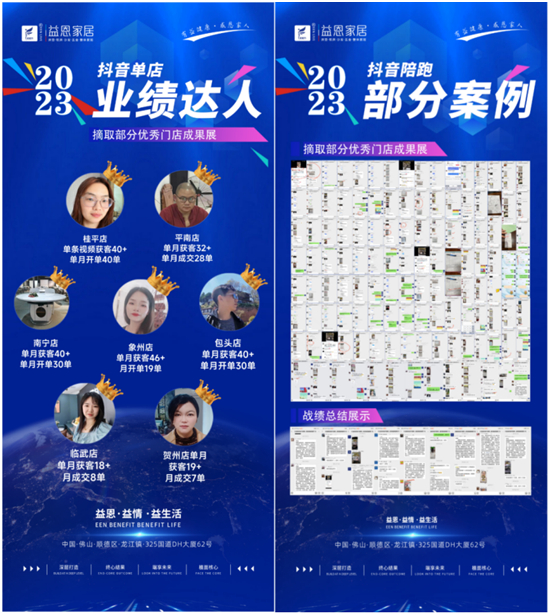 2023年以来,益恩家居总部开展了“抖音同城长期陪跑班”培训,活动开展以来取得了巨大成效。因此,在此次展会上益恩家居展示了众多经销商抖音赋能的成功案例。这些成功案例不仅展示了益恩家居与经销商的合作成果,也为其他经销商提供了宝贵的经验和启示。