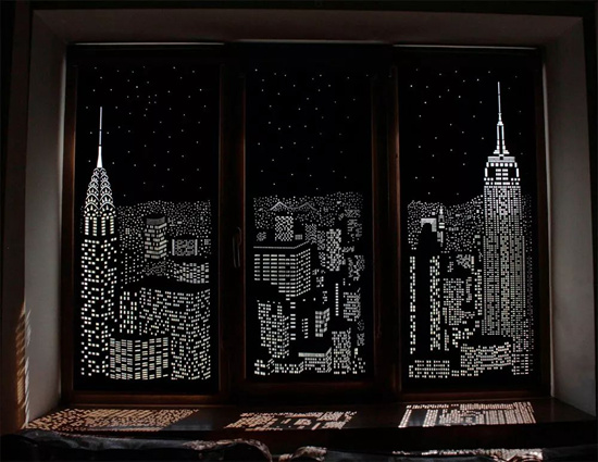 完好地复刻出灯火明亮的窗户与布满繁星的夜空