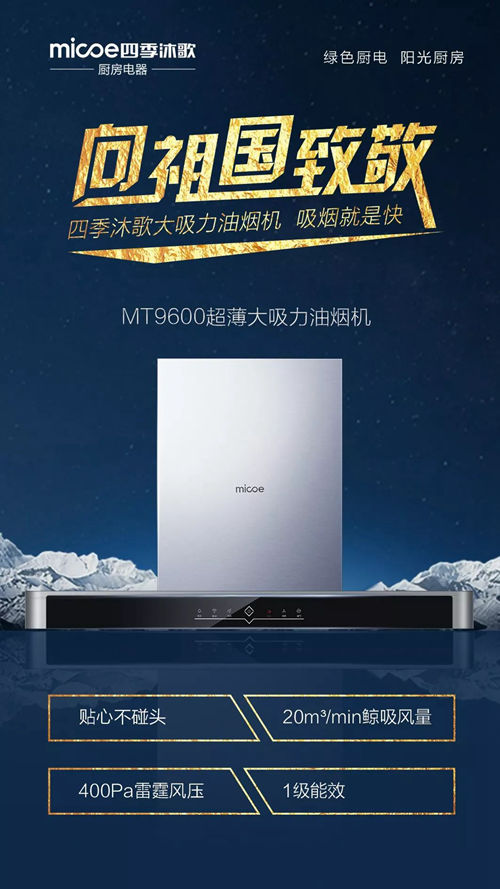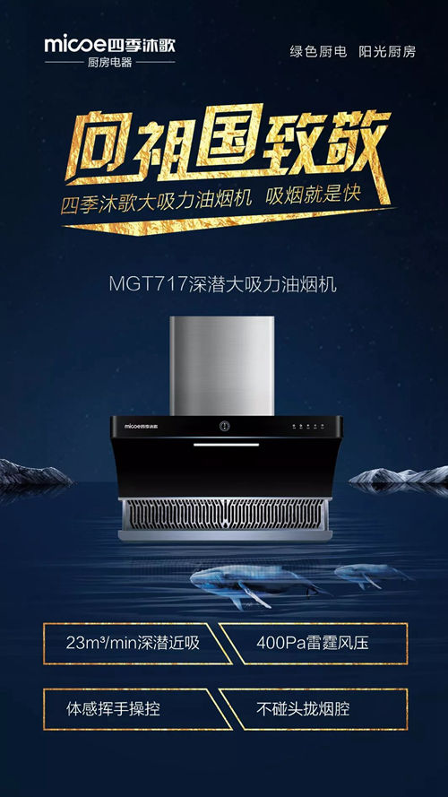 “向祖国致敬”,可以看做是四季沐歌厨房电器对旗下产品的一次全面巡礼,也可以看作是四季沐歌厨电为其所聚焦的县乡市场的消费者所制定的国庆悦宾盛宴,正是秋季家装和新婚人群选购厨电产品的好时机。
