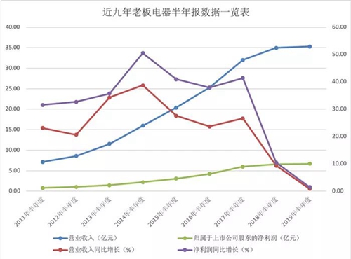 8月27日,老板电器公布的2019年半年报显示,当期实现营业收入35.27亿元,同比增长0.88%;实现归属于上市公司股东的净利润6.70亿元,同比增长1.52%。虽然2019年H1老板电器营业收入和净利润都还有微涨,但对比2017年之前同时期平均20%以上的业绩增长,从2018年开始,增幅可谓是出现了断崖式的下跌。
