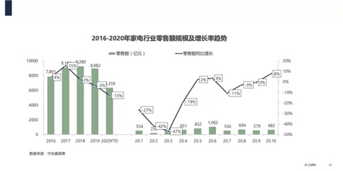 根据中怡康推算数据显示,中国家电零售市场1-10月规模在6358亿元,在"黑天鹅"之下呈现13%的大幅下滑,这是多年以来的首次大幅下滑,而这个数字在2018年和2019年分别为2%、-3%。但是从月度看回复的态势明显,尤其是10月份同比正增8个百分点,表现非凡。