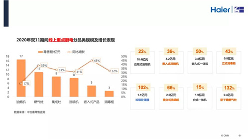 产品端看,分层明显,一方面是讲究性价比的线上渠道迅猛发展,一方面线下高价位高品质的产品份额也在提升。根据中怡康线下零售监测数据显示,油烟机6000元以上、燃气灶3600元以上、嵌入式电烤箱9000元以上、洗碗机10000元以上、集成灶10000元以上的产品量份额分别获得了0.7%、0.9%、3.9%、1.3%、5.4%的提升,借势升级成为了品牌的共识,无论是传统的大家电烟灶还是新兴品类洗碗机集成灶。另外从双十一大促来看,线上某些细分品类获得了极大的增长,比如垃圾处理器、嵌入式一体机、独立式洗碗机、防干烧燃气灶等。