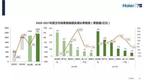 中怡康预测2020年全年厨卫市场规模预计在2162亿元,2021年市场增速在7%,规模增长至2322亿元,回暖至2019年市场状态。具体分品类看,2021年洗碗机增速高达18%,呈领衔之势,嵌入式厨电则排名其后,增速在12%。明年市场的重心将在核心城市的换新需求与下沉市场的新增需求上,同时普及型产品如洗碗机、嵌入式一体机、集成灶仍将处在上升通道中,能否满足消费者的诉求将成为品牌发展与否的唯一标准。